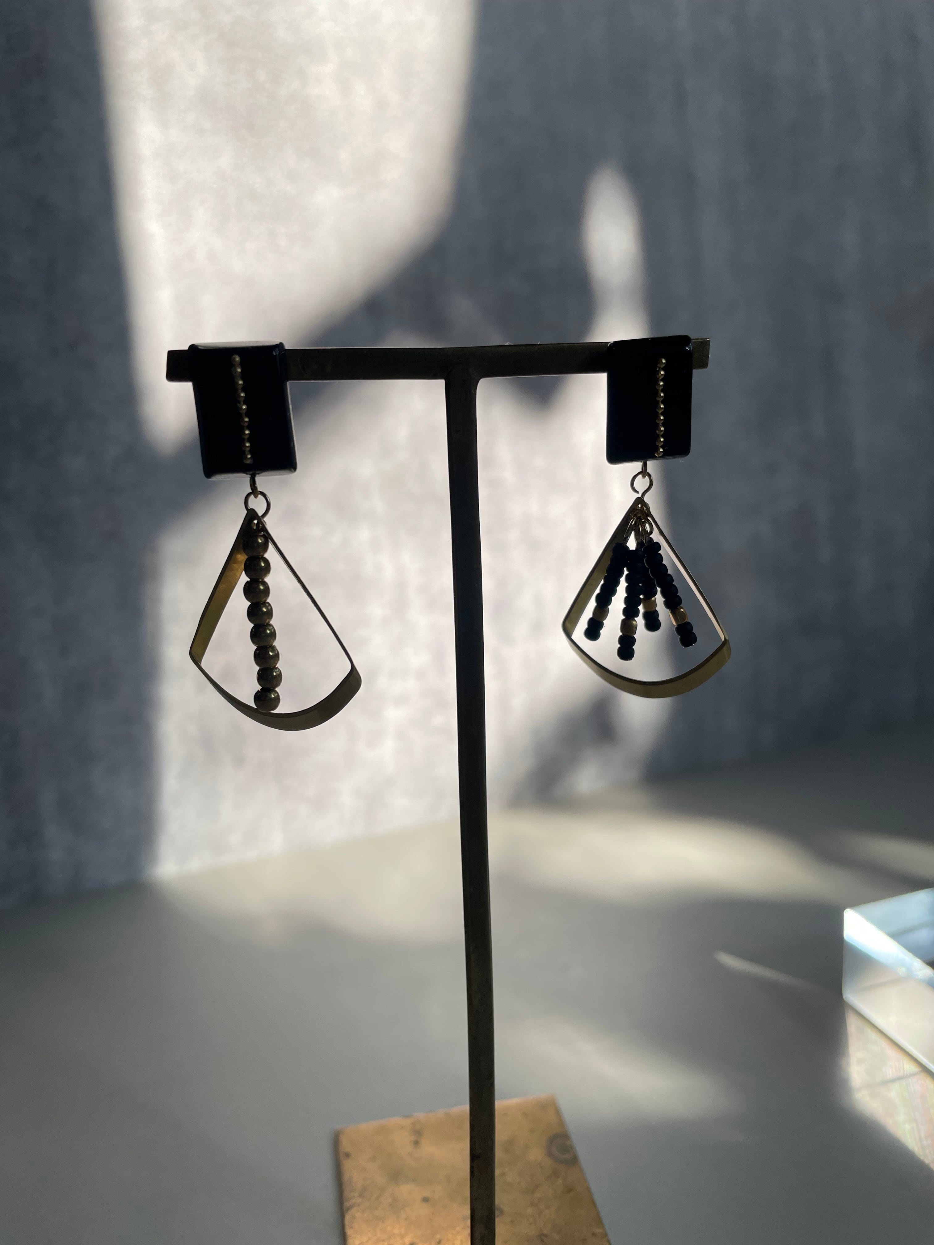 このアシンメトリーのアクセサリーは、扇のようなパーツにビーズが揺れるデザインが特徴で、視線を集める華やかさを演出します。デイリーから特別なシーンまで、幅広く活躍する存在感があります。