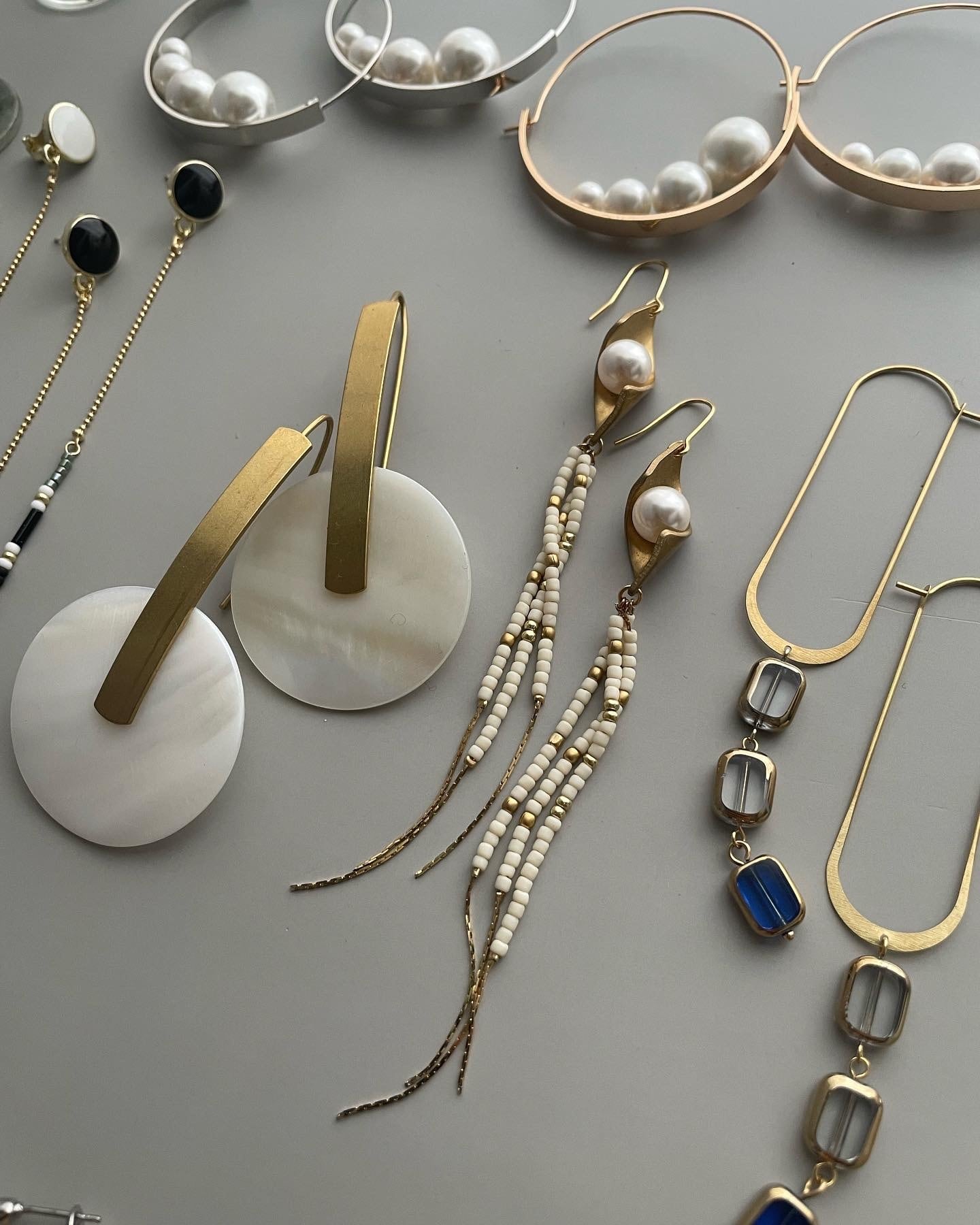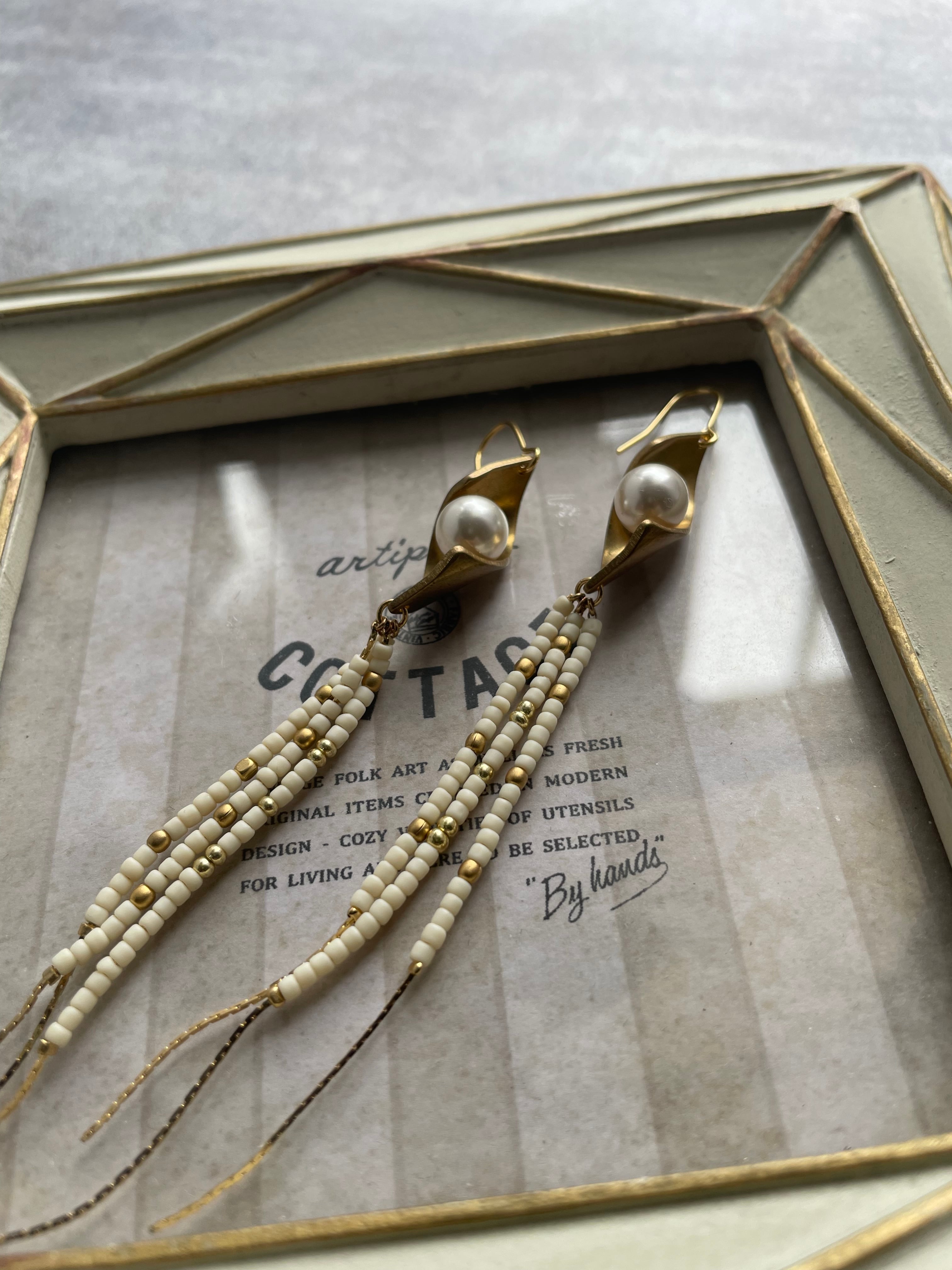 真鍮に包まれPearlと、ビーズのフリンジを合わせて、エレガントでありなが、遊び心のある夏のオシャレなアクセントにぴったりなアクセサリー♡