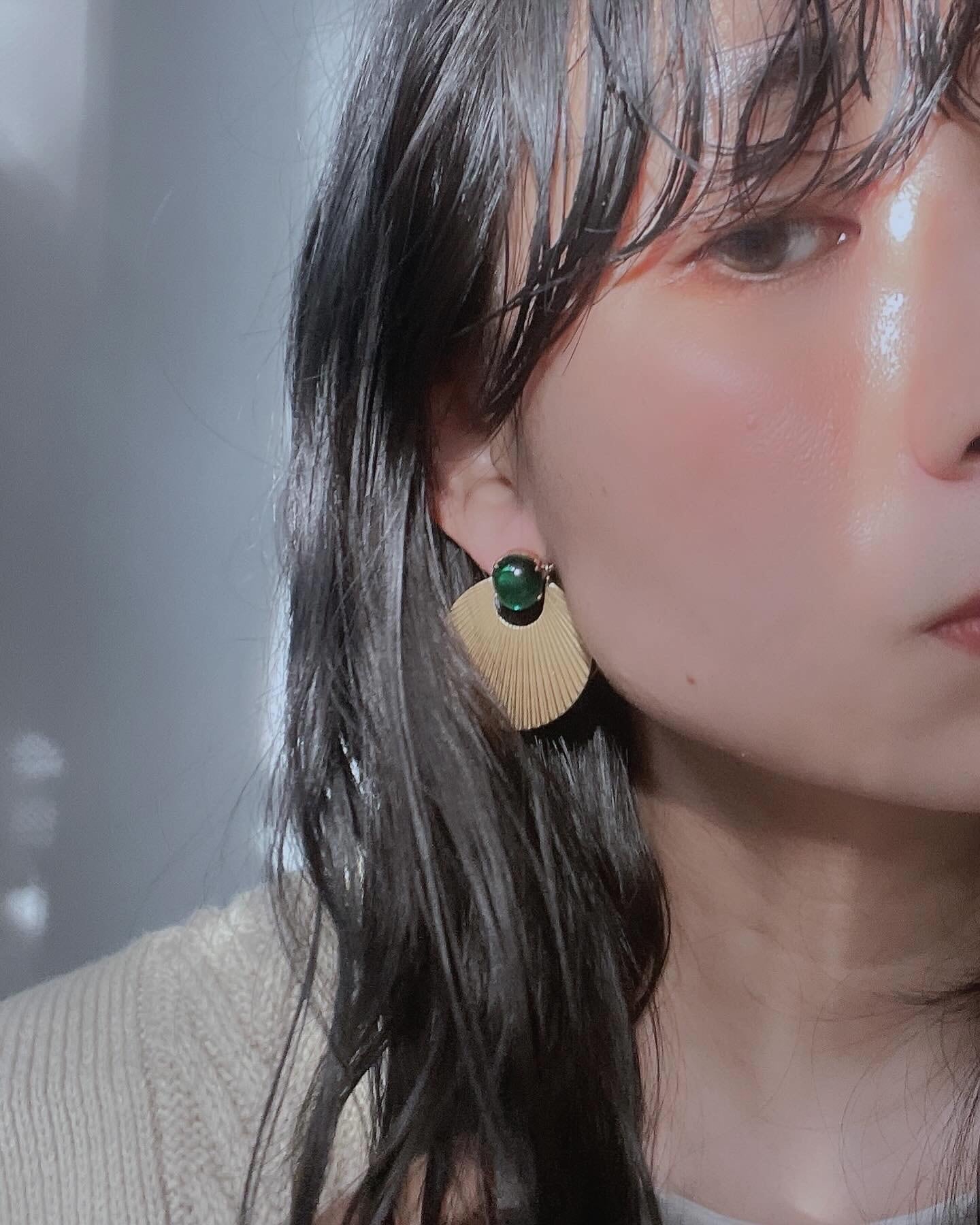 宝石のようなグリーンのガラスカボションと真鍮が美しい、アンティーク感溢れるアクセサリーです